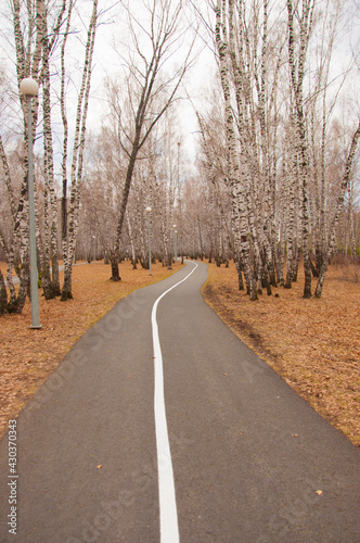 Bike path in a city Park, bike path sign on asphalt