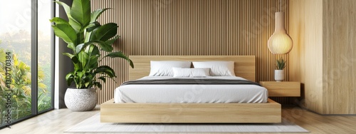 Biophilic minimalist bedroom, wooden panel accent wall, floating bed with linen bedding, sculptural ceramic pendant light, indoor plants, sunrise over