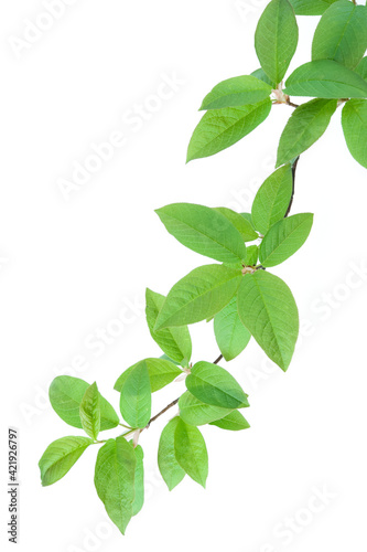 Bird cherry (Prunus padus) branch and green leaves in springtime, isolated on white background.