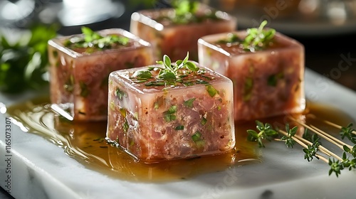 Bite-sized pâté in aspic appetizers, featuring smooth pâté encased in jelly with tiny herb garnishes, served on a marble platter with cocktail toothpicks and tiny garnishes,