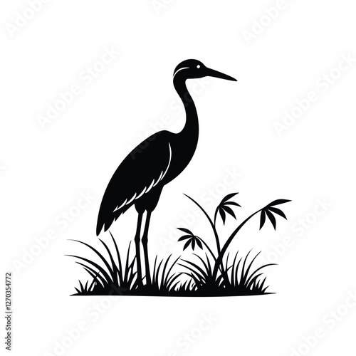 Black and White Heron Bird Silhouette with Grass – Vector Illustration