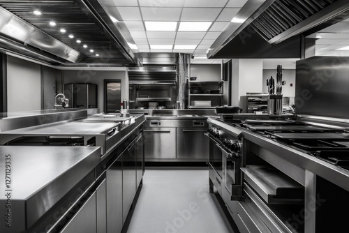 commercial, kitchen, black, white, interior, eatery, cooking, food, service, culinary, kitchen utensile, appliance, utensil, equipment, dining, eatery, establishment