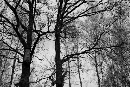 Black and white picture of forest trees without leaves and with nesting box. Autumn nature.