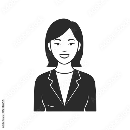 smiling, female, avatar, asian, young, illustration, portrait, face, icon, character, woman, suit, formal, professional, cartoon, design, vignetting, drawing, simple, business, happy, abstract, graphic, monochrome, style, expression