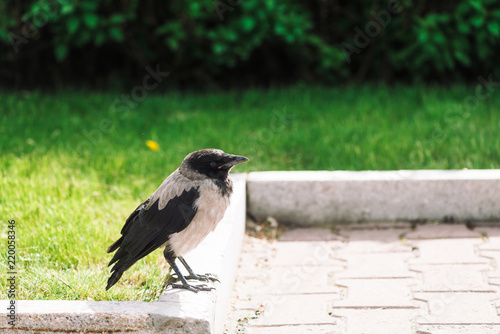 Black crow walks on border near gray sidewalk on background of rich greenery with copy space. Raven on pavement near green grass and bushes. Wild bird on asphalt close up. Predatory animal of city.