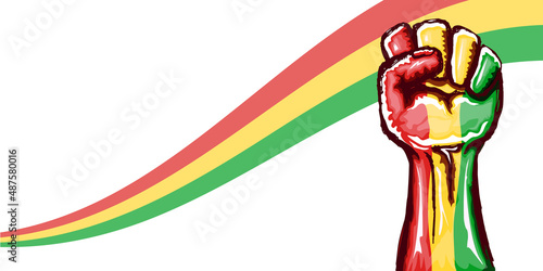 Black history month horizontal banner with protest raised fist colored in African flag isolated on white background. Black history month horizontal poster, flyer with black mans fist