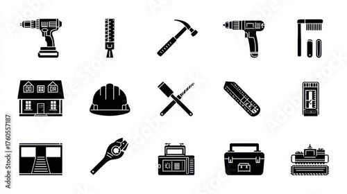 tool, construction, repair, home, house, drill, hammer, hard hat, safety, equipment, wrench, toolbox, building, industry, work, maintenance, improvement, bricolage, renovation, silhouette, icon, set, measure, level, brush