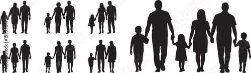 Black silhouettes of families walking hand in hand on white background family people