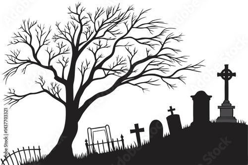 Black silhouettes of halloween tombstones crosses & trees