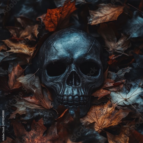 Black Skull in Autumn Leaves, Halloween Background, Dark and Moody Still Life.