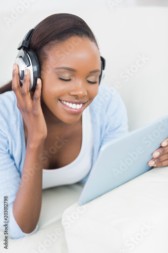 couch, sofa, living room, lounge, dark hair, black hair, long hair, happy, smiling, merry, joyful, cheerful, tablet, touch screen, scrolling, touching, using, earphones, listening, music, enjoying