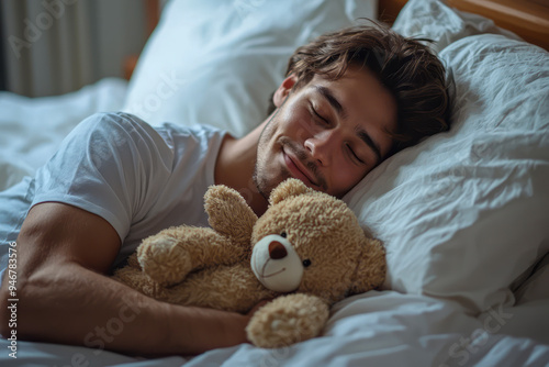 "Blissful man peacefully sleeping with teddy bear on soft pillows, lost in sweet dreams of deep slumber"