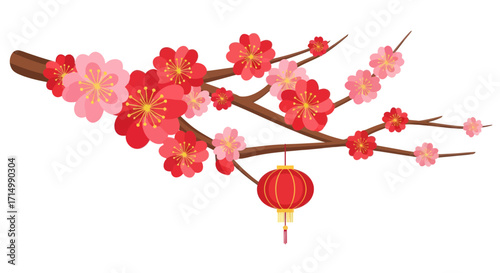 plum, blossom, tree branch, flower, floral, red, pink, bloom, spring, oriental, chinese, new, year, lantern, decoration, festive, celebration, traditional, asian, culture, decorative, design, element, graphic, vector, illustration, art, artwork, botanical, nature, plant, season, seasonal, blooming, vibrant, bright, cheerful, lucky, prosperity, happiness, ornament, twig, stem, beauty, elegant, delicate, artistic, drawing