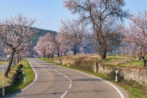 Blossoming almond trees along a country road in the Palatinate/Germany
