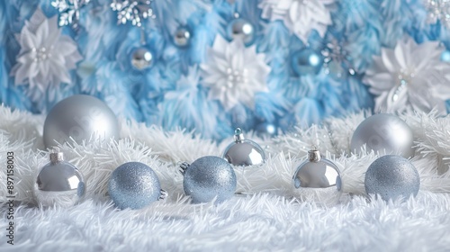 Blue and silver decorations on white fur Festive holiday backdrop