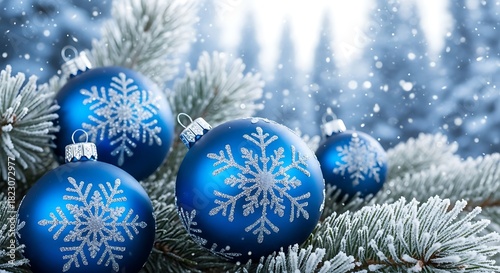 Blue christmas ornaments with snowflakes on frosty pine branches