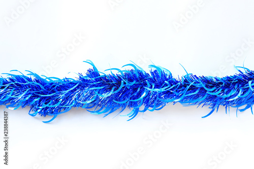 Blue colors bunch fur or Christmas tree tinsel garland on white background. Christmas and New year celebration.