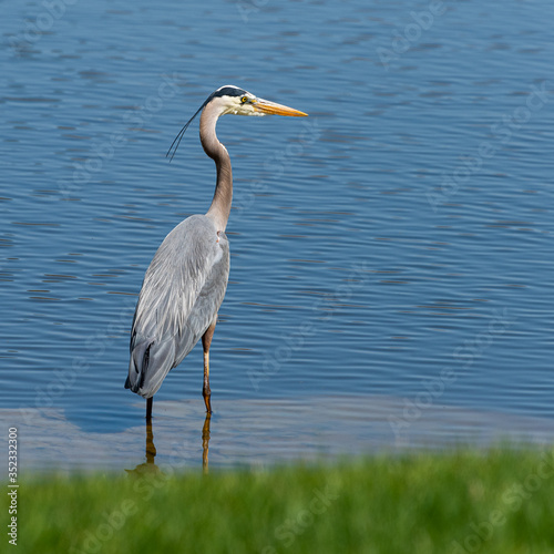 heron, bird, blue, wading, water, standing, nature, animal, wildlife, lake, wild, outdoors, no people, nobody, duck pond, urban, colorado, sunny, spring, green, grass