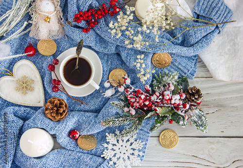 Blue knitted sweater, white cup with coffee, homemade cookies, white candles, snowflakes on a light wooden table, top view, flat lay. The concept of a New Year card, Christmas holidays. Save space