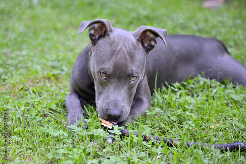 puppy, 1, dog, pet, cute, adorable, funny, charismatic, character, beautiful, canino, mammal, companion, blue, dangerous, outside, grass, lying, day, summer, green, relaxing, stick, chewing, playing, stare, gaze, serious