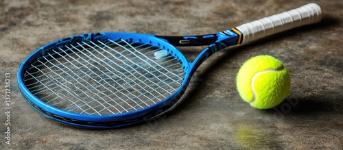 Blue tennis racket and ball on concrete