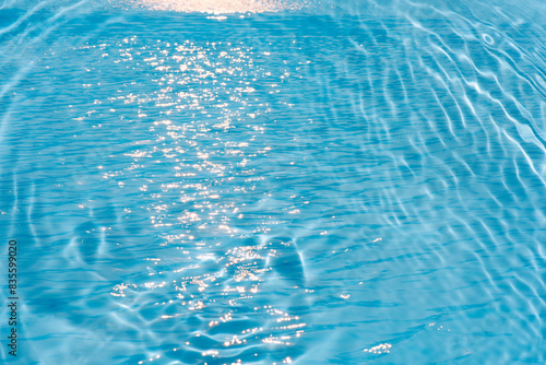 Blue water with ripples on the surface. Defocus blurred transparent blue colored clear calm water surface texture with splashes and bubbles. Water waves with shining pattern texture background.
