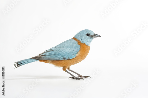 bird, blue, orange, white, background, isolated, feather, beak, eye, tail, wing, exotic, tropical, wildlife, nature, animal, avian, perched, standing, looking, right, studio