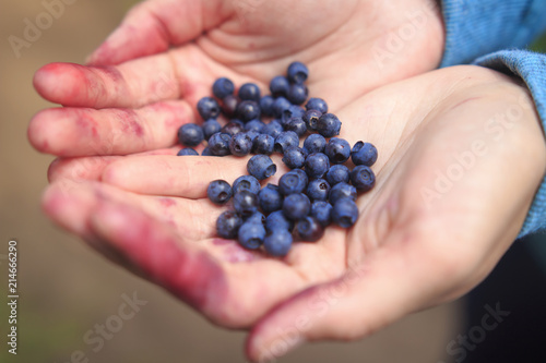 Blueberry berries in the hands of the girl close-up. Hands in blueberry juice.