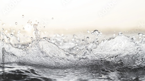 Blurred desaturated transparent clear calm water surface texture with splashes and bubbles trendy abstract nature background white-grey water waves in sunlight copy space