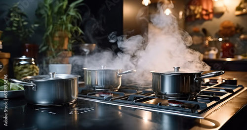Boiling water in a cooking pot an pan on a induction stove in the modern kitchen.