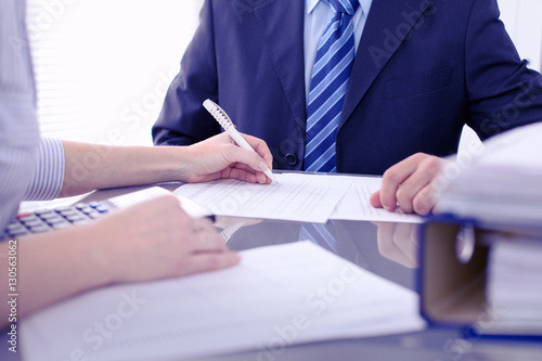 Bookkeepers or financial inspector making report, calculating or checking balance. Audit concept.
