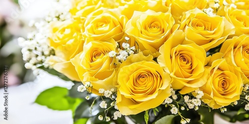 Bouquet of yellow roses with baby's breath, in natural soft light for gifts