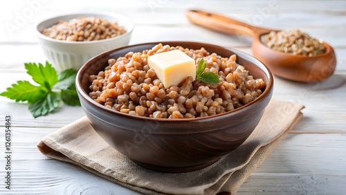 buckwheat, porridge, butter, bowl, wooden bowl, wooden spoon, grain, health food, healthy eating, breakfast, dinner, cookery, food photography, closeup, delicious, tasty, alimentary, wholesome, home cooking, rustic, natural light, topview, white background, wooden table, parsley, garnish, side dish, dietary, vegetarian, vegan, comfort food, russian food