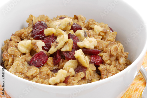Bowl of oatmeal with dried fruit and nuts.