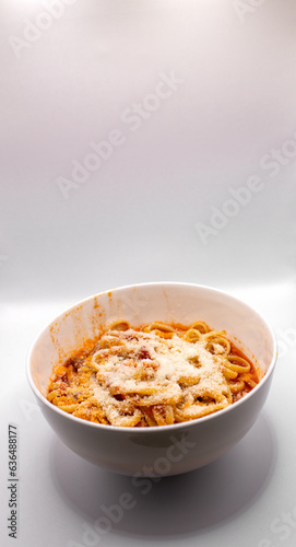 food, meal, dish, dinner, cookery, bowl, plate, lunch, healthy, breakfast, epicure, fresh, white, red, cheese, nobody, closeup, pasta, tomatoes, spaghetti, white bowl, white background, italy, italian, italian food, romano