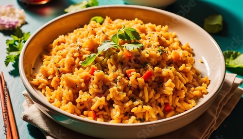 Bowl Of Savory Yellow Rice With Vegetables And Herbs Close Up Shot