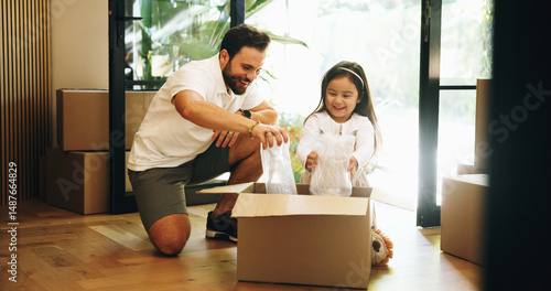 Box, moving in or relocation with dad and daughter in new home for property or real estate investment. Development, growth or unpacking with single parent man and girl child in apartment for mortgage