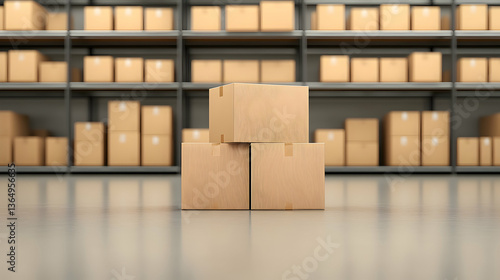 Boxes stacked in a warehouse Storage shelves in the background