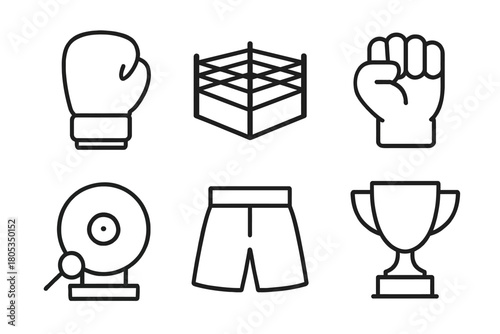 boxing, icon, glove, ring, fist, bell, short, trophy, outline, sport, equipment, competition, match, design, symbol, champion, arena, gym, fight, athlete, coach, punch, fitness, training, physical exercise, victory, succeed, endurance, discipline, strength, art, achievement, icon, vector
