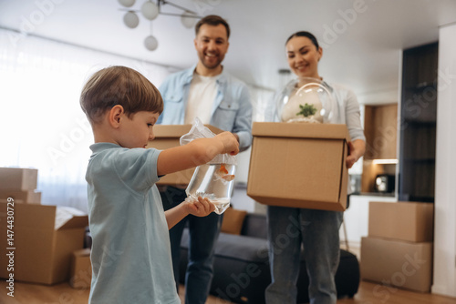 Boy is holding package with fish. Family of husband, wife and son are moving into new house
