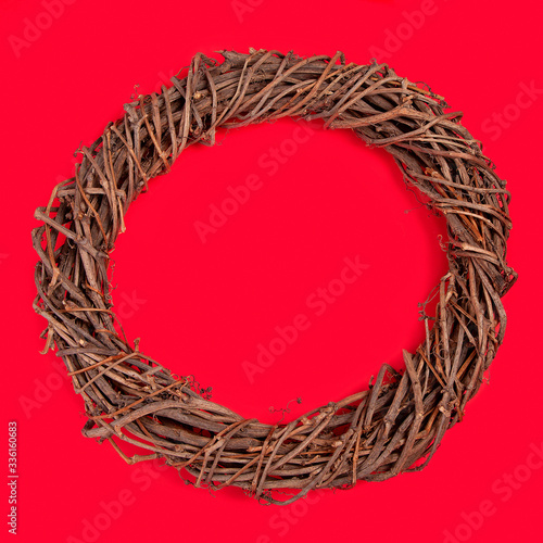 Braided vine wreath on a red background. The view from the top. Handmade from natural material. It is used in floral design to create arrangements for holidays, Christmas, Christmas decor.