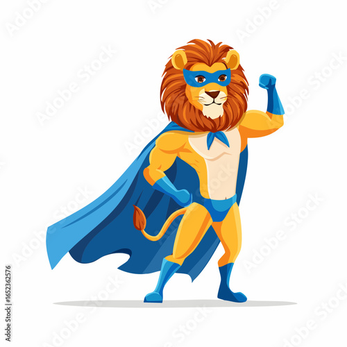 Brave cartoon lion superhero character in a classic blue costume and cape, flexing his bicep to show power and strength.