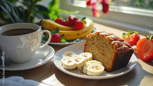 Breakfast scene featuring a cup of coffee, banana bread, banana slices, strawberries, and fresh fruit on a wooden table