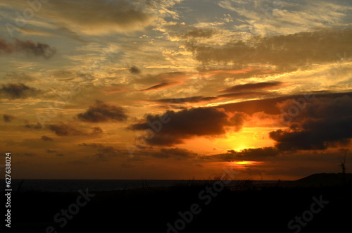 silhouette, silhouetted, gold, orange, sunrise, sunset, seascape, beach, coast, coastal, shore, landscape, stunning, scenic, view, scenery, beautiful, wave, gorgeous, water, sky, nature, outdoors, afterglow, dawn, dusk, ocean, aruba, sea, isolated, shoreline, cloud, cloudy, sky