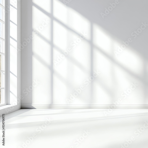 Bright, minimalistic room with large windows casting soft shadows on white floors.