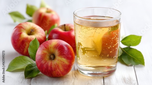 Bright red apples sit next to a glass of sparkling cider on a wooden table. The sunlight highlights the natural beauty of the fruit and drink, evoking a refreshing atmosphere.