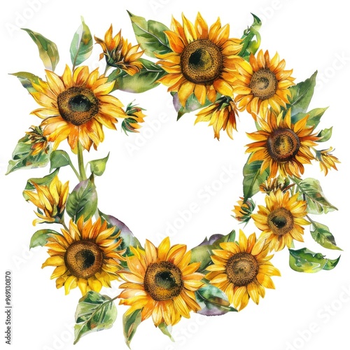 sunflower, chaplet, white, background, floral, bright, vibrant, summer, design, flower, nature, botanical, illustration, yellow, green, flower petals, leaf, blooming, sunny, cheerful, artwork, decorative, rustic, seasonal, arrangement, garden, elegant, artistic, centrepiece, round, circle, frame, foliage, harvest, radiant, warm, fresh, colourful, flora, beautiful, natural, blossom, festive, watercolor, detailed, summer