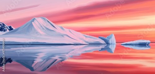 Brightly colored sunset reflecting on icy waters with floating glaciers, stylized art, arctic serenity, polar sunset vibes