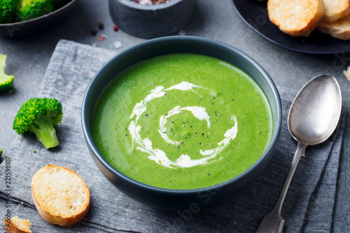 Broccoli cream soup in a bowl with toasted bread. Go green concept