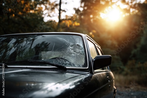 car, windscreen, broken, glasses, fractured, forest, tree, sun, light, nature, damage, autumn, leaf, dark, grey, vehicle, detail, close, up, scene, damaged, horizon, landscape, sunset, morning, evening, daylight, shadow, broken glass, fragile, safety, accident, disaster, hazard, repair, transportation, automobile